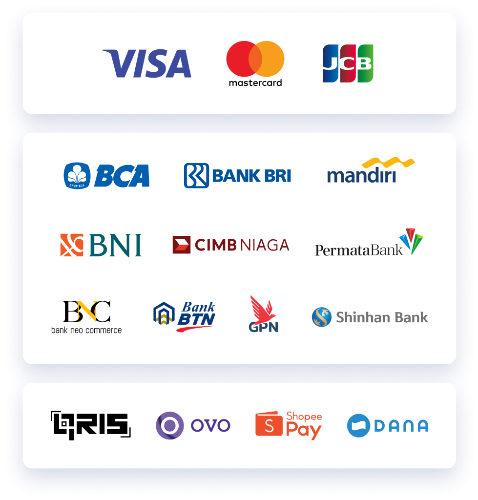 Kami memahami preferensi Anda yang beragam. Saluran pembayaran kami terhubung dengan berbagai metode pembayaran baik dari dalam maupun dari luar negeri, mulai dari transfer bank, kartu kredit, dan digital, memberikan Anda fleksibilitas penuh untuk memilih cara yang paling sesuai.